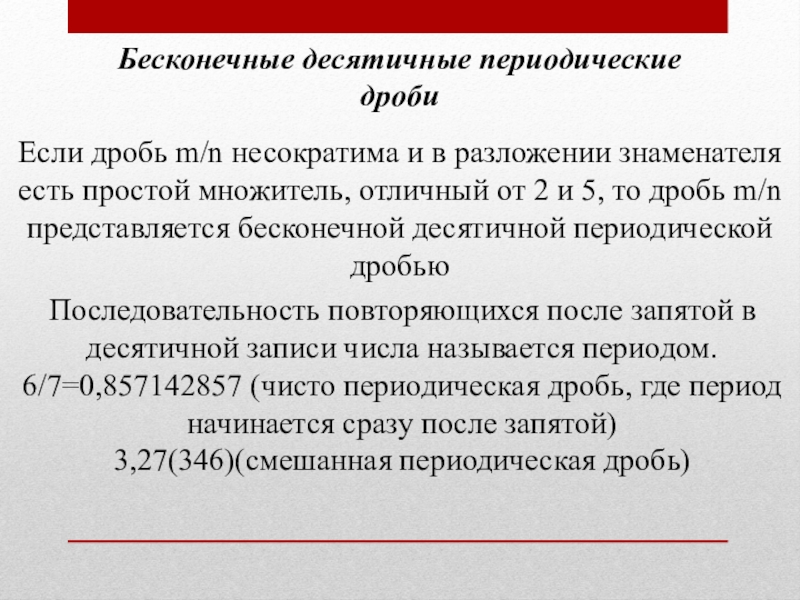 есть простой множитель, отличный от 2 и 5, то дробь m/n представляется бесконечной десятичной периодической дробью