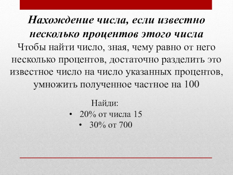 Слайд 32Нахождение числа, если известно несколько процентов этого числа
