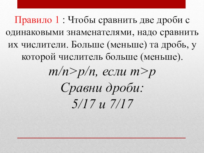Слайд 9Правило 1 : Чтобы сравнить две дроби с одинаковыми знаменателями, надо
