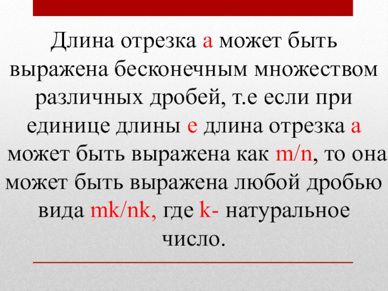 Слайд 4Длина отрезка а может быть выражена бесконечным множеством различных дробей, т.е
