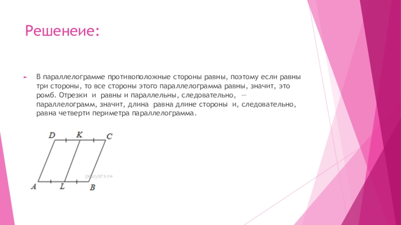 все стороны этого параллелограмма равны, значит, это ромб. Отрезки и равны и параллельны, следовательно, — параллелограмм, значит, длина равна длине стороны и, следовательно, равна четверти периметра параллелограмма.