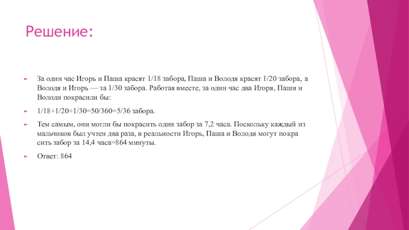 Тем самым, они могли бы покрасить один забор за 7,2 часа. Поскольку каждый из мальчиков был учтен два раза, в реальности Игорь, Паша и Володя могут покрасить забор за 14,4 часа=864 минуты.