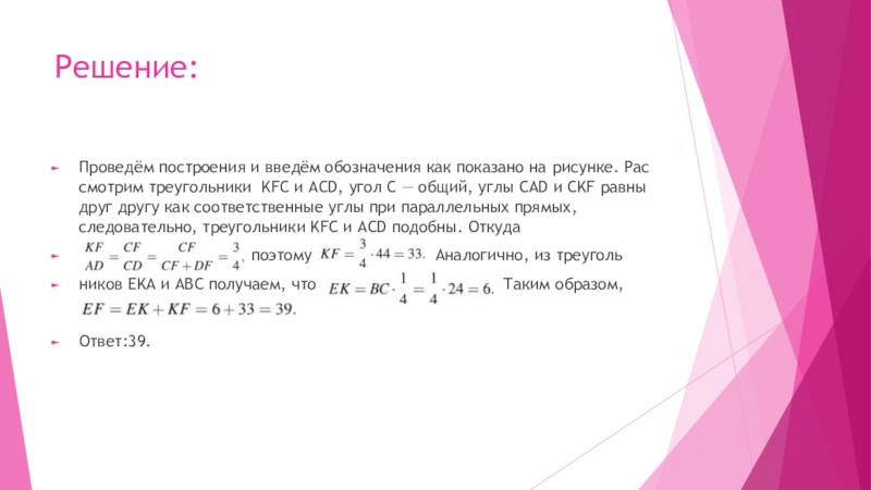 KFC и ACD, угол C — общий, углы CAD и CKF равны друг другу как соответственные углы при параллельных прямых, следовательно, треугольники KFC и ACD подобны. Откуда