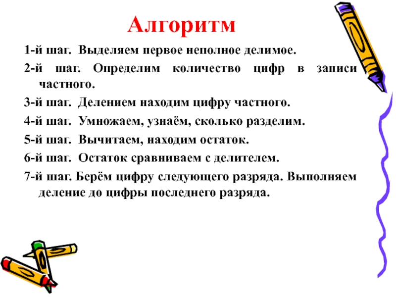 Алгоритм1-й шаг. Выделяем первое неполное делимое.2-й шаг. Определим количество цифр в записи частного.3-й шаг. Делением находим цифру
