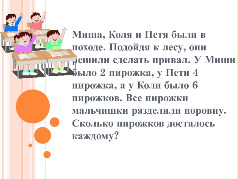 решили сделать привал. У Миши было 2 пирожка, у Пети 4 пирожка, а у Коли было 6 пирожков. Все пирожки мальчишки разделили поровну. Сколько пирожков досталось каждому?
