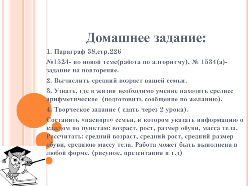 Составить «паспорт» семьи, в котором указать информацию о каждом по пунктам: возраст, рост, размер обуви, масса тела. Рассчитать: средний возраст, средний рост, средний размер обуви, среднюю массу тела. Работа может быть выполнена в любой форме. (рисунок, презентация и т.д)