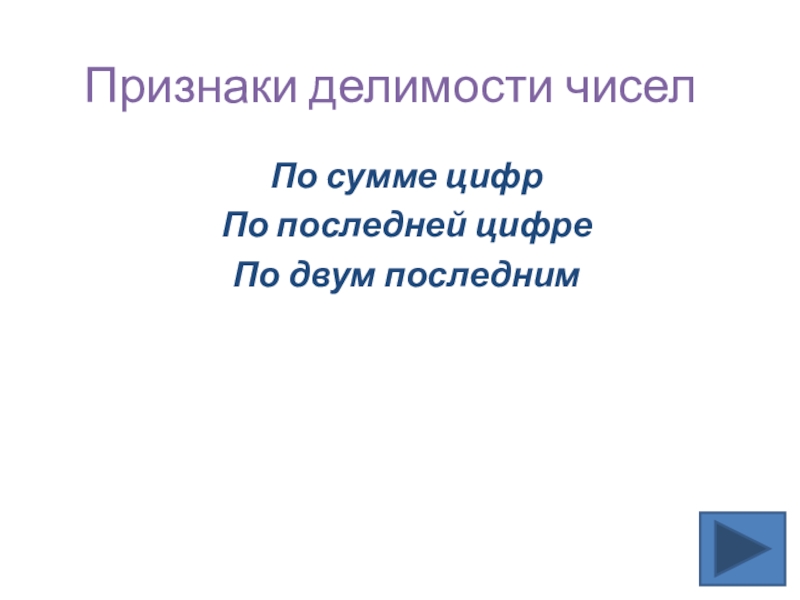 Признаки делимости чиселПо сумме цифрПо последней цифреПо двум последним