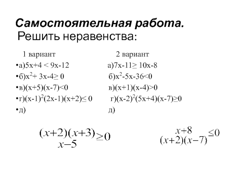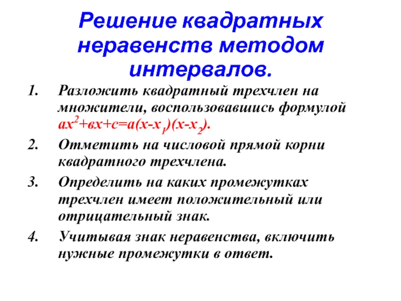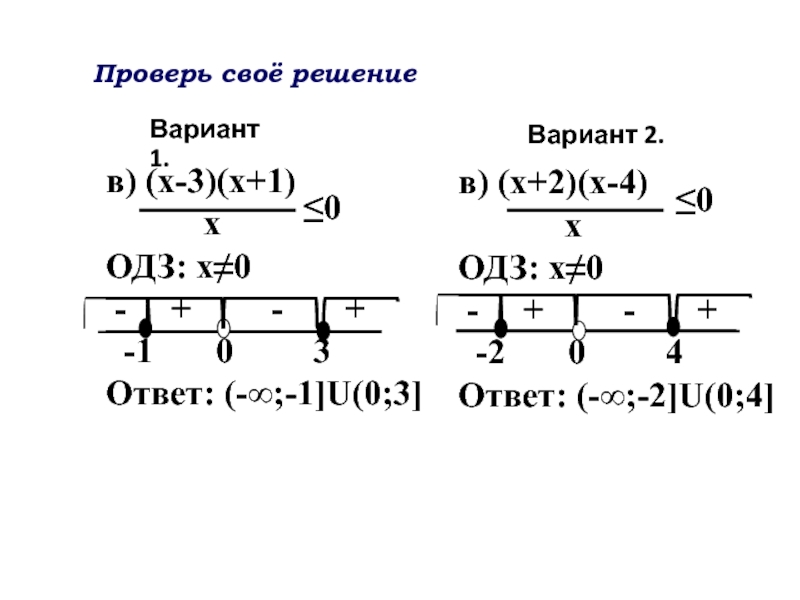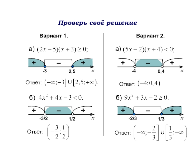 3) Определим знак многочлена на каждом интервале. Теперь легко ответить на вопрос задачи, при каких значениях х знак многочлена неотрицательный. Отметим на рисунке нужные нам области, получим: