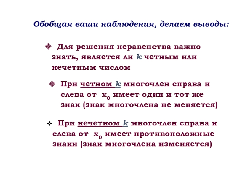 При нечетном k многочлен справа и слева от х0 имеет противоположные знаки (знак многочлена изменяется)