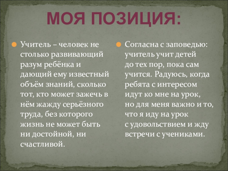 Согласна с заповедью: учитель учит детей до тех пор, пока сам учится. Радуюсь, когда ребята с интересом идут ко мне на урок, но для меня важно и то, что я иду на урок с удовольствием и жду встречи с учениками.