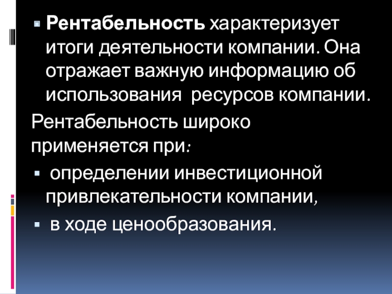 Слайд 6Рентабельность характеризует итоги деятельности компании. Она отражает важную информацию об использования