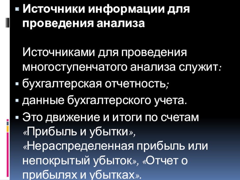 Источники информации для проведения анализа  Источниками для проведения многоступенчатого анализа служит:бухгалтерская отчетность; данные бухгалтерского учета. Это