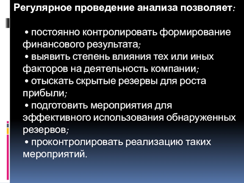 Регулярное проведение анализа позволяет:  • постоянно контролировать формирование финансового результата; • выявить степень влияния тех или