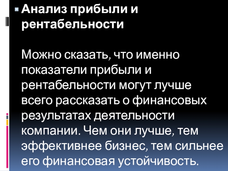 Слайд 8Анализ прибыли и рентабельности Можно сказать, что именно показатели прибыли и рентабельности