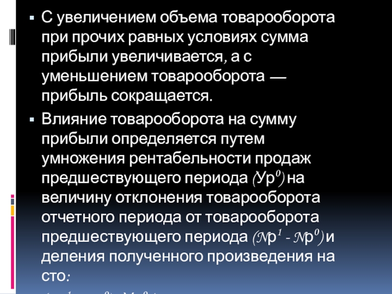 С увеличением объема товарооборота при прочих равных условиях сумма прибыли увеличивается, а с уменьшением товарооборота — прибыль