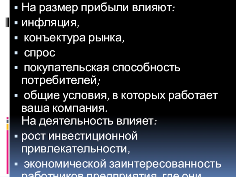 На размер прибыли влияют: инфляция, конъектура рынка, спрос покупательская способность потребителей; общие условия, в которых работает ваша
