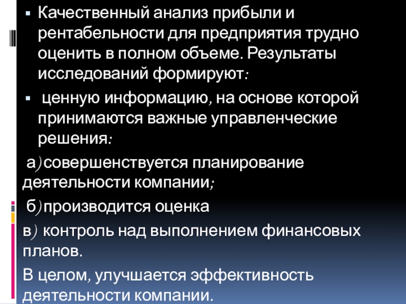 Качественный анализ прибыли и рентабельности для предприятия трудно оценить в полном объеме. Результаты исследований формируют: ценную информацию,