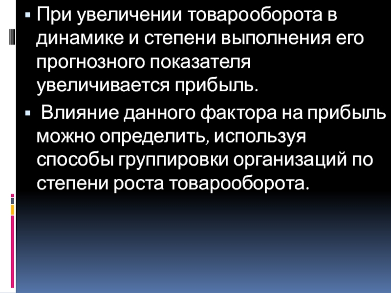 Слайд 15С увеличением объема товарооборота при прочих равных условиях сумма прибыли увеличивается,