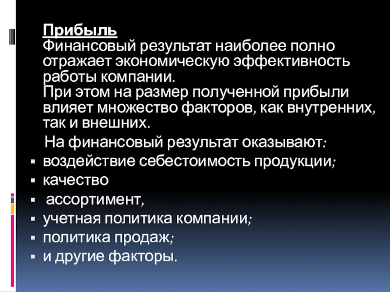 размер полученной прибыли влияет множество факторов, как внутренних, так и внешних.