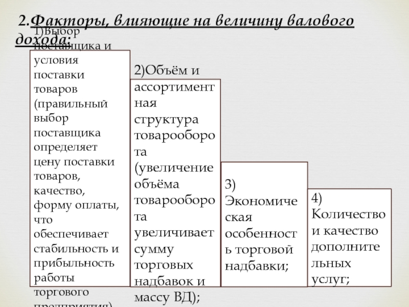 1)Выбор поставщика и условия поставки товаров(правильный выбор поставщика определяет цену поставки товаров, качество, форму оплаты, что обеспечивает стабильность и прибыльность работы торгового предприятия).