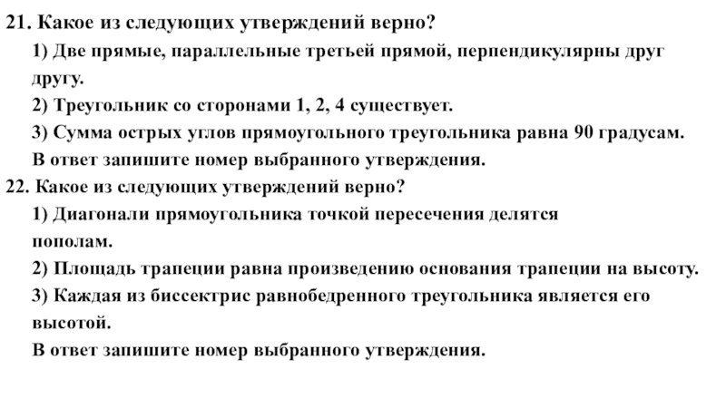 2) Сумма острых углов прямоугольного треугольника равна 90 градусам.
