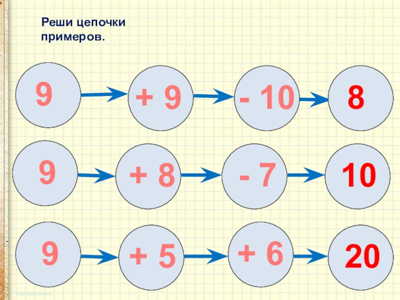 Реши цепочки примеров.9+ 9- 1089+ 8- 7109+ 5+ 620