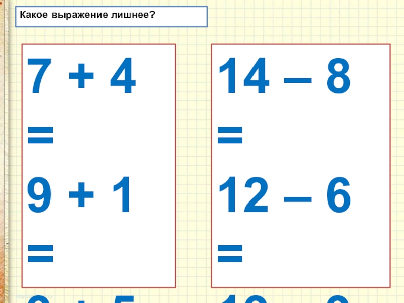 7 + 4 = 9 + 1 =9 + 5 =8 + 3 =Какое выражение лишнее?14 –