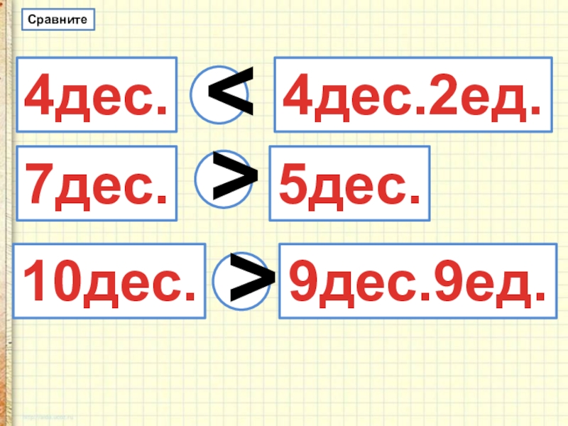 Сравните4дес.4дес.2ед.10дес.9дес.9ед.>