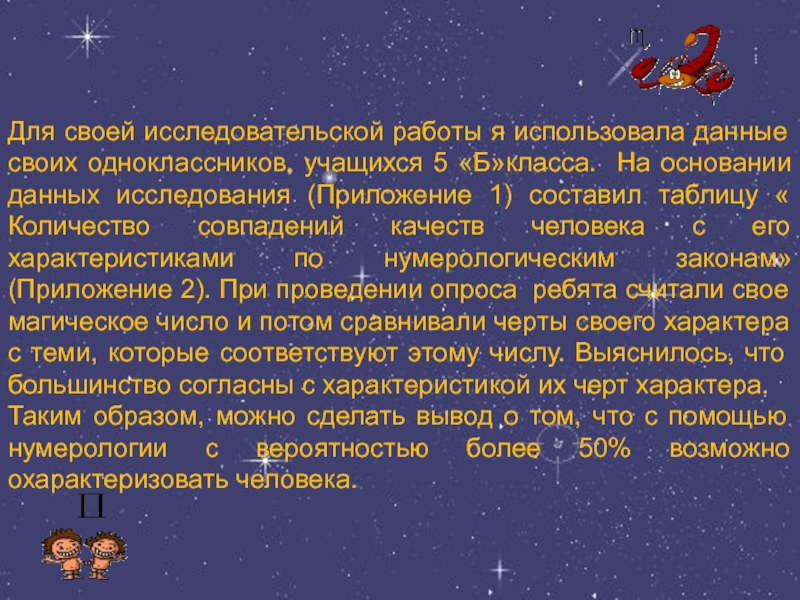 5 «Б»класса. На основании данных исследования (Приложение 1) составил таблицу « Количество совпадений качеств человека с его характеристиками по нумерологическим законам» (Приложение 2). При проведении опроса ребята считали свое магическое число и потом сравнивали черты своего характера с теми, которые соответствуют этому числу. Выяснилось, что большинство согласны с характеристикой их черт характера.
