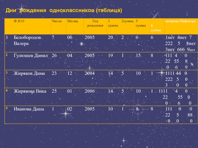 Дни рождения одноклассников (таблица)