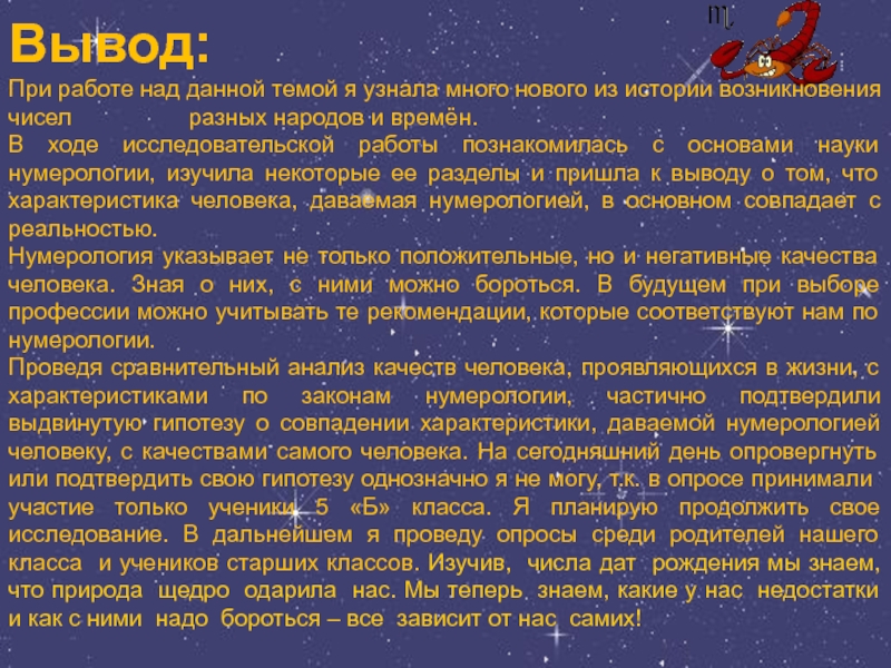 Проведя сравнительный анализ качеств человека, проявляющихся в жизни, с характеристиками по законам нумерологии, частично подтвердили выдвинутую гипотезу о совпадении характеристики, даваемой нумерологией человеку, с качествами самого человека. На сегодняшний день опровергнуть или подтвердить свою гипотезу однозначно я не могу, т.к. в опросе принимали участие только ученики 5 «Б» класса. Я планирую продолжить свое исследование. В дальнейшем я проведу опросы среди родителей нашего класса и учеников старших классов. Изучив, числа дат рождения мы знаем, что природа щедро одарила нас. Мы теперь знаем, какие у нас недостатки и как с ними надо бороться – все зависит от нас самих!