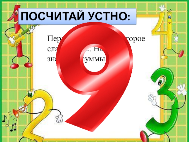 Первое слагаемое 7, второе слагаемое 2. Найдите значение суммы. ПОСЧИТАЙ УСТНО: