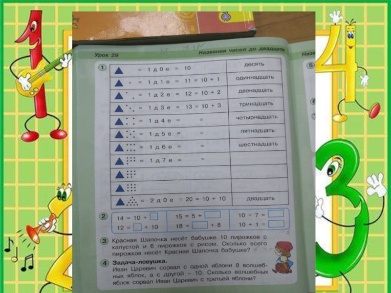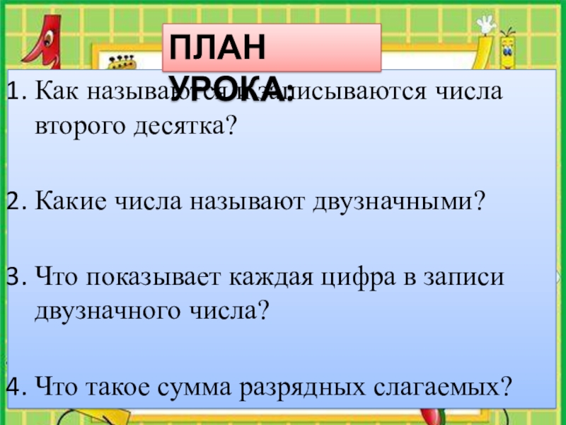 Как называются и записываются числа второго десятка?Какие числа называют двузначными?Что показывает каждая цифра в записи двузначного числа?Что