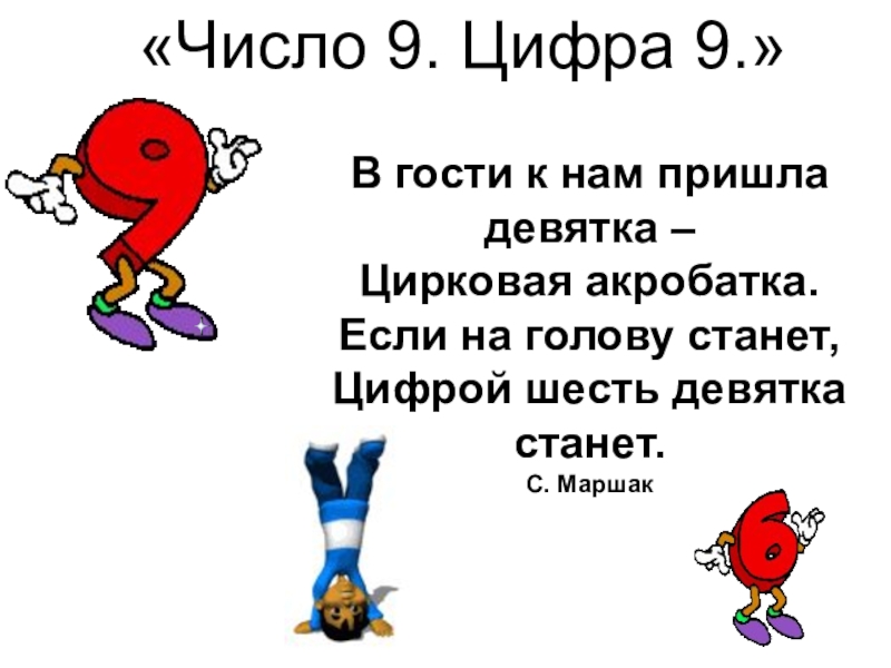 В гости к нам пришла девятка – Цирковая акробатка. Если на голову станет, Цифрой шесть девятка станет. С. Маршак«Число 9. Цифра 9.»