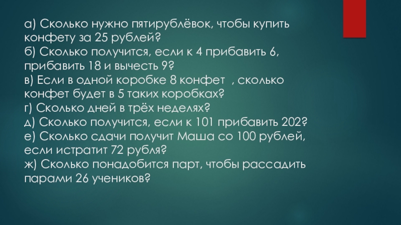 Слайд 5а) Сколько нужно пятирублёвок, чтобы купить конфету за 25 рублей?