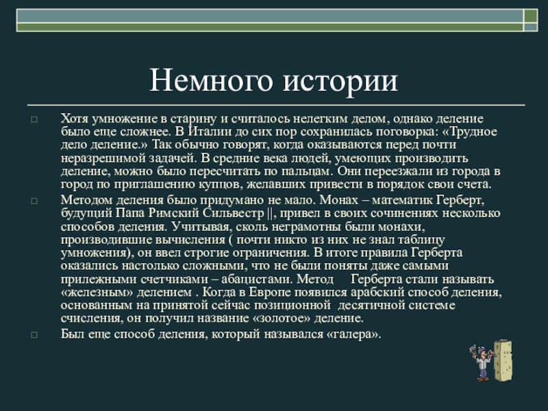 Методом деления было придумано не мало. Монах – математик Герберт, будущий Папа Римский Сильвестр ||, привел в своих сочинениях несколько способов деления. Учитывая, сколь неграмотны были монахи, производившие вычисления ( почти никто из них не знал таблицу умножения), он ввел строгие ограничения. В итоге правила Герберта оказались настолько сложными, что не были поняты даже самыми прилежными счетчиками – абацистами. Метод Герберта стали называть «железным» делением . Когда в Европе появился арабский способ деления, основанным на принятой сейчас позиционной десятичной системе счисления, он получил название «золотое» деление.