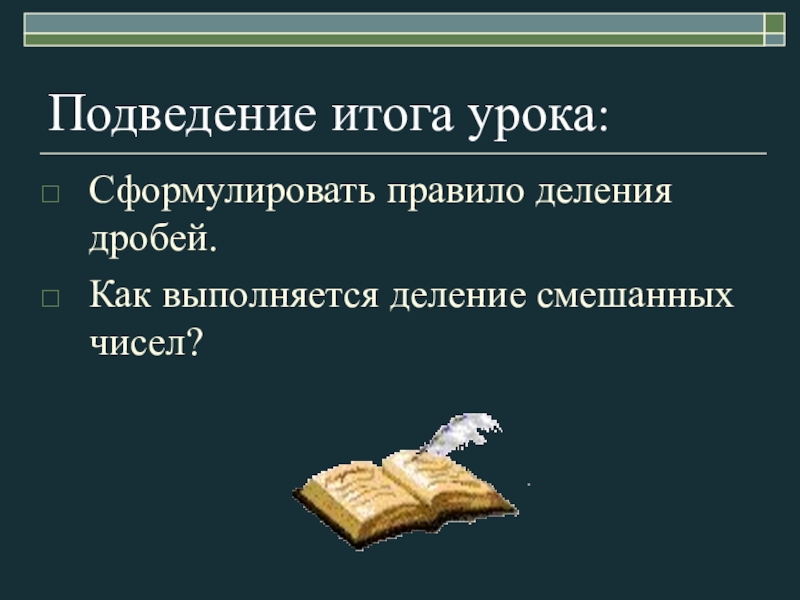 Подведение итога урока: Сформулировать правило деления дробей.Как выполняется деление смешанных чисел?