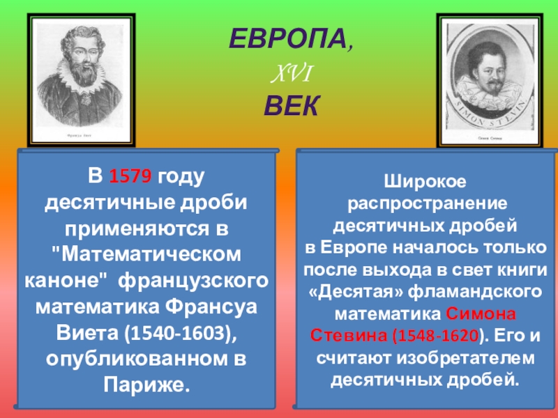 в Европе началось только после выхода в свет книги «Десятая» фламандского математика Симона Стевина (1548-1620). Его и считают изобретателем десятичных дробей.