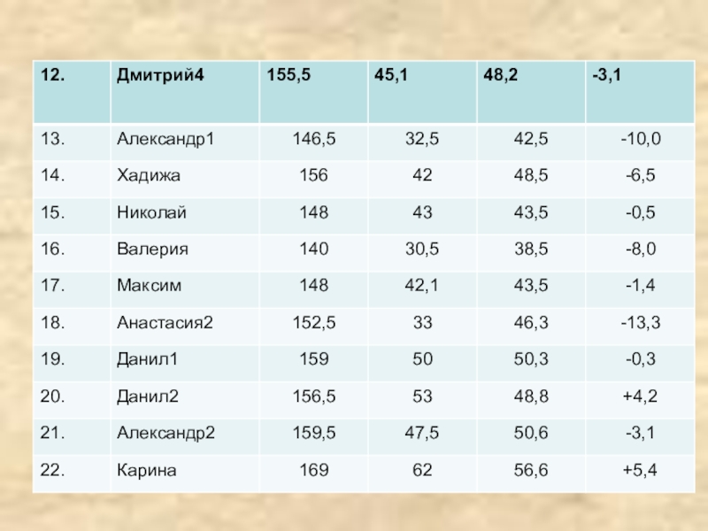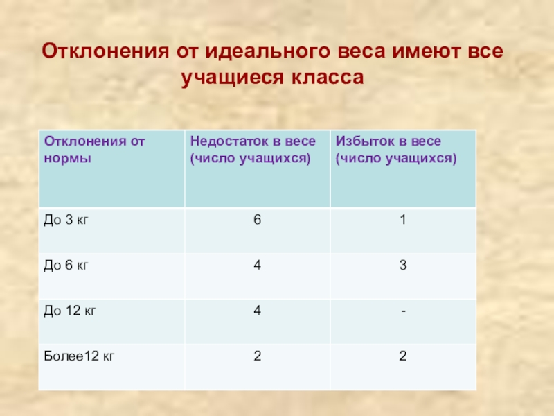 рассчитать математические отклонения веса от нормы;