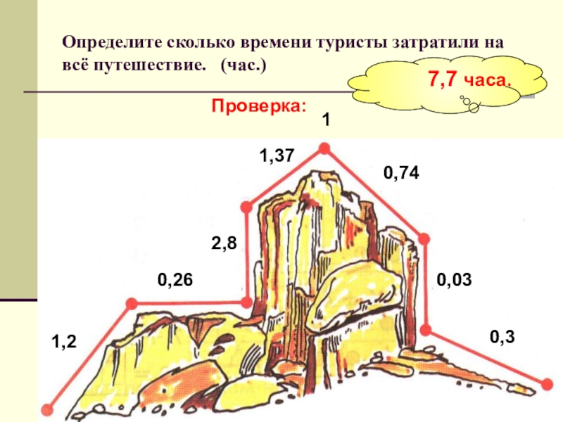 Определите сколько времени туристы затратили на всё путешествие.  (час.)1,20,262,81,3710,740,030,37,7 часа.Проверка: