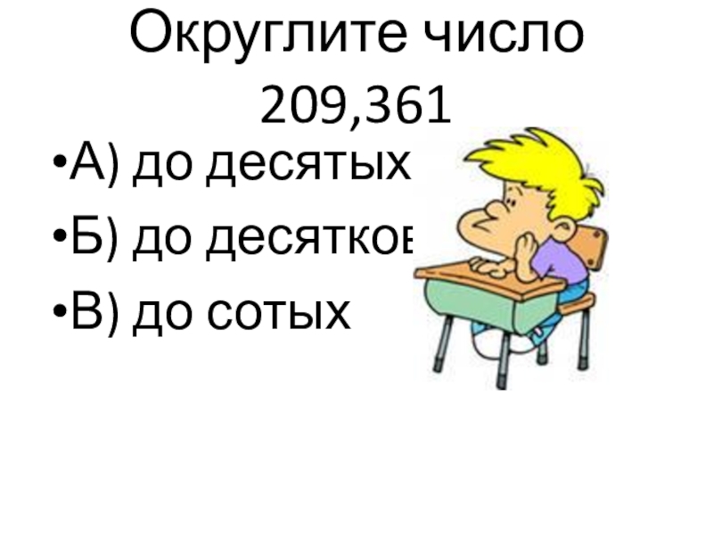 Округлите число 209,361А) до десятыхБ) до десятковВ) до сотых