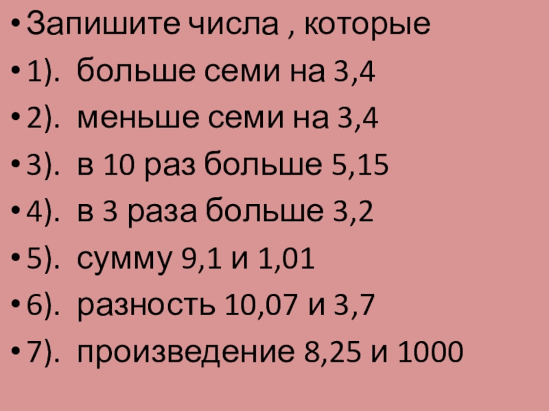 Запишите числа , которые1). больше семи на 3,42). меньше семи на 3,43). в 10 раз больше 5,154).
