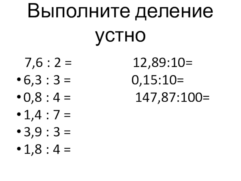 Выполните деление устно  7,6 : 2 =         12,89:10=6,3