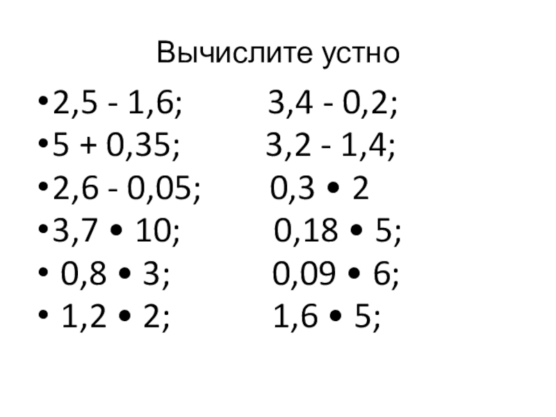 Вычислите устно2,5 - 1,6;         3,4 - 0,2;          5 + 0,35; 3,2 - 1,4;  2,6 - 0,05;   0,3 • 2