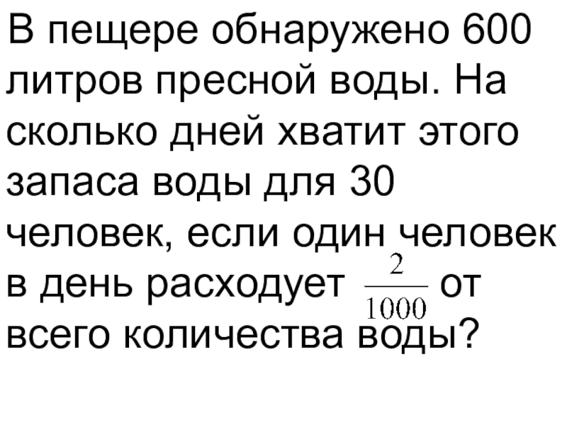 Слайд 18В пещере обнаружено 600 литров пресной воды. На сколько дней хватит