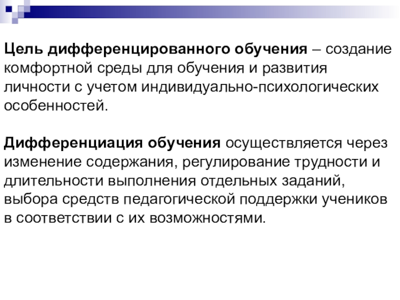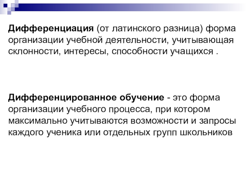Дифференцированное обучение - это форма организации учебного процесса, при котором максимально учитываются возможности и запросы каждого ученика или отдельных групп школьников