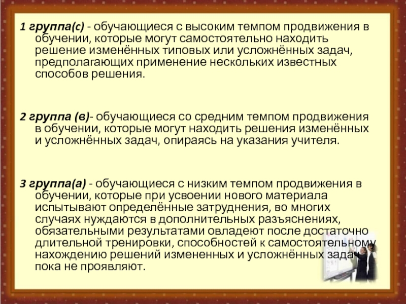 Слайд 31 группа(c) - обучающиеся с высоким темпом продвижения в обучении, которые