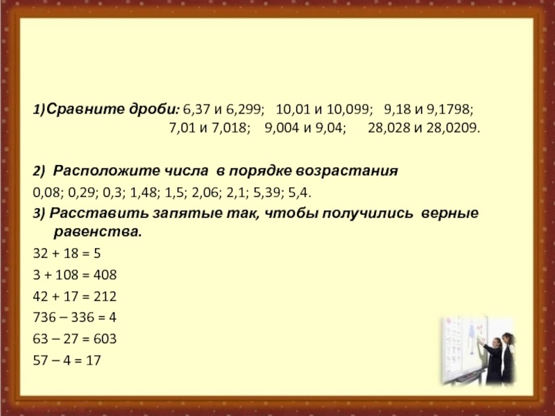 1)Сравните дроби: 6,37 и 6,299; 10,01 и 10,099; 9,18 и 9,1798;