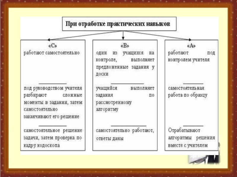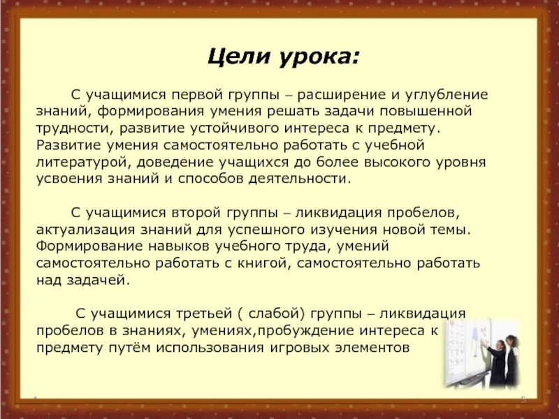 С учащимися второй группы – ликвидация пробелов, актуализация знаний для успешного изучения новой темы. Формирование навыков учебного труда, умений самостоятельно работать с книгой, самостоятельно работать над задачей.