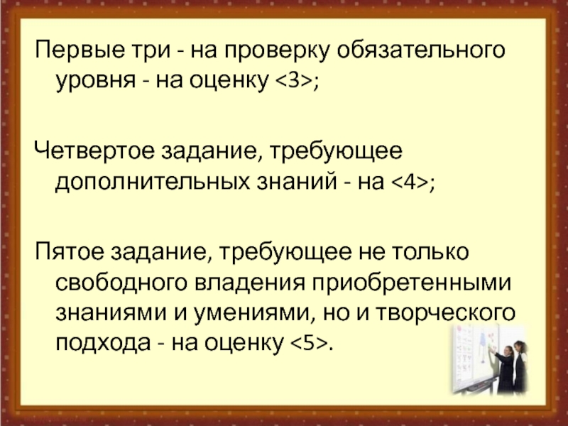 Слайд 11Первые три - на проверку обязательного уровня - на оценку ;